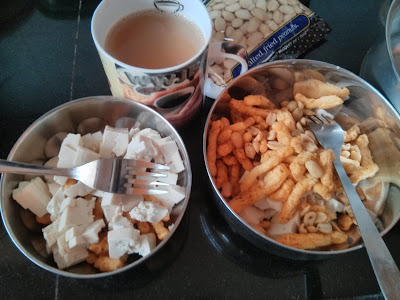 Total cost - Rs.30 = ~$0.50 (Tofu - Rs. 22, Rs. 4 for snacks, Rs. 2 for peanuts, Rs. 2 for Lemon juice.)